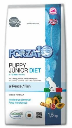 Forza10 Puppy Junior Diet Pesce, alimento ad altissimo valore biologico, elevata digeribilità e ricco di acidi grassi insaturi Omega3 naturalmente presenti nell’olio di pesce, rappresenta l’alimentazione ideale per tutti i cuccioli.