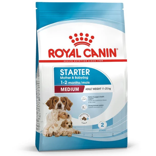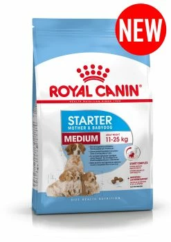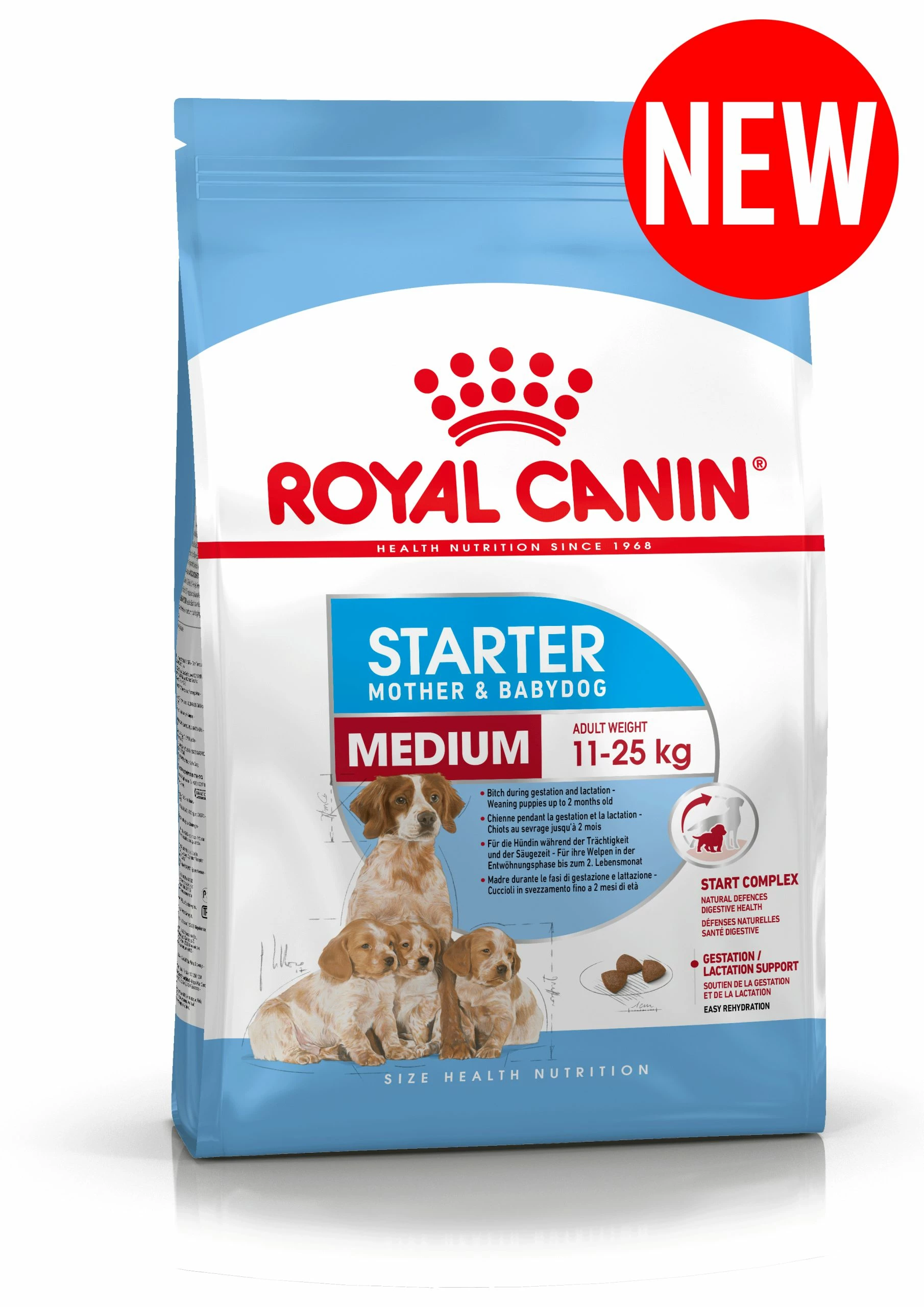 ROYAL CANIN® Medium: Starter Mother & Babydog è una soluzione nutrizionale specifica adattata agli elevati fabbisogni energetici della madre di media taglia (peso da adulto compreso tra gli 11 e i 25 kg) alla fine della gestazione e durante la lattazione e dei cuccioli in svezzamento fino 2 mesi di età . Contiene un complesso scientificamente provato tra cui vitamina C e vitamina E per contribuire allo sviluppo delle difese naturali del cucciolo. Inoltre, la combinazione di prebiotici e proteine altamente digeribili favorisce l’equilibrio del microbiota intestinale a supporto della salute digestiva. Le crocchette di ROYAL CANIN® Medium Starter Mother & Babydog sono facili da reidratare con acqua, permettendo di ottenere una consistenza particolarmente morbida, ottimale per promuovere il passaggio dal latte al cibo solido. In appena 8 settimane i tuoi cuccioli avranno bisogno di un alimento appositamente formulato per soddisfare i fabbisogni nutrizionali legati alla successiva fase di crescita. Per questo periodo ROYAL CANIN®propone Medium Puppy, un alimento completo e bilanciato, disponibile secco (crocchette) e umido (bocconcini in salsa).